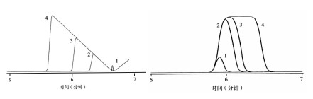 右圖:樣品體積對(duì)峰寬和峰型的影響,峰1到峰4,進(jìn)樣體積逐漸增大。