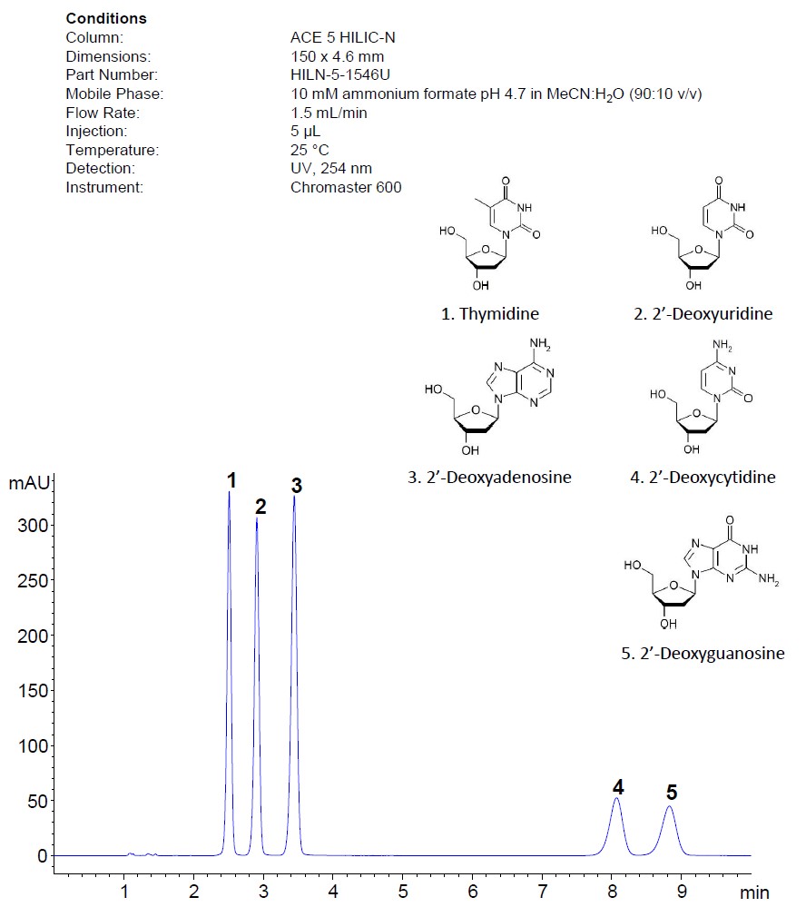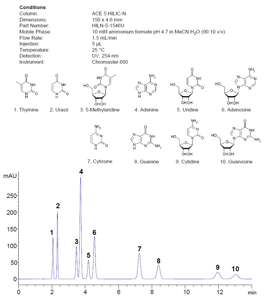 ACE HILIC-N是ACE三款親水作用色譜柱中的中性柱,相對于陰陽離子都顯示出較低的離子交換能力,通過極性相互作用、吸附和一定程度的分散(分配能力)來保留分離核酸堿基、核糖核苷和脫氧核糖核苷。