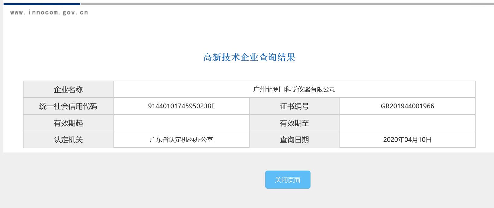 根據(jù)國(guó)家《高新技術(shù)企業(yè)認(rèn)定管理辦法》和《高新技術(shù)企業(yè)認(rèn)定管理工作指引》的相關(guān)規(guī)定,廣州菲羅門(mén)科學(xué)儀器有限公司被認(rèn)定為國(guó)家級(jí)高新技術(shù)企業(yè)。 菲羅門(mén)高新企業(yè)證書(shū)編號(hào):GR201944001966