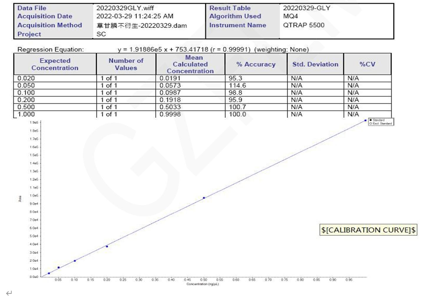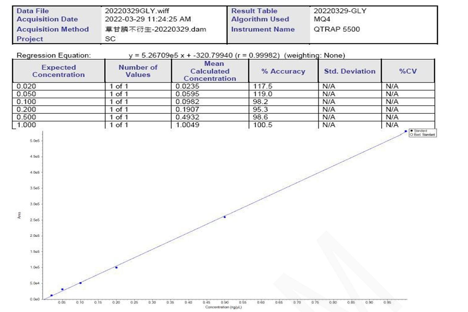 AB 質(zhì)譜儀,從 0.02 ppm 至 1 ppm 的 MS 校準(zhǔn)曲線如下