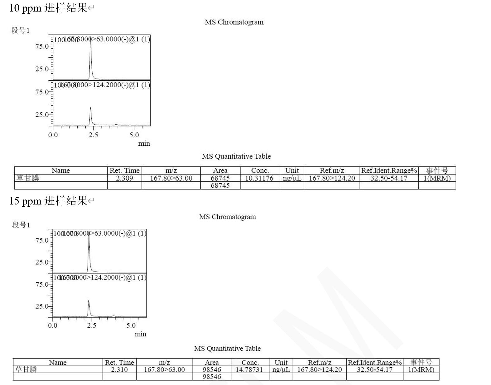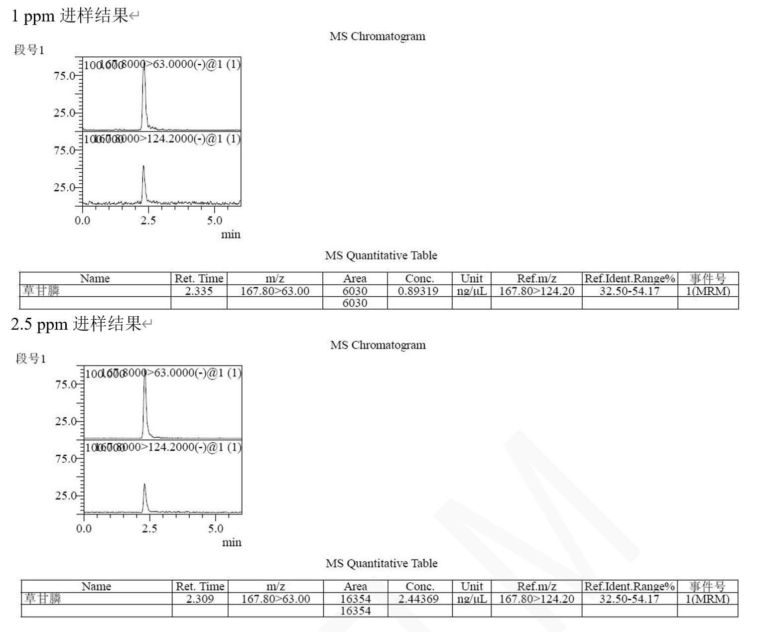 說明:本方法研究草甘膦不衍生直接檢測(cè)。相比于傳統(tǒng)衍生后用 C18 分析,或者用氨基柱不衍生 PH=10-11 條件下分析,帶來的復(fù)雜,耗時(shí),以及氨基柱結(jié)果重現(xiàn)與壽命上的問題。此方法簡(jiǎn)單,快速,方便。可滿足常規(guī)分析檢測(cè)需求以及多數(shù)殘留檢測(cè)需求。