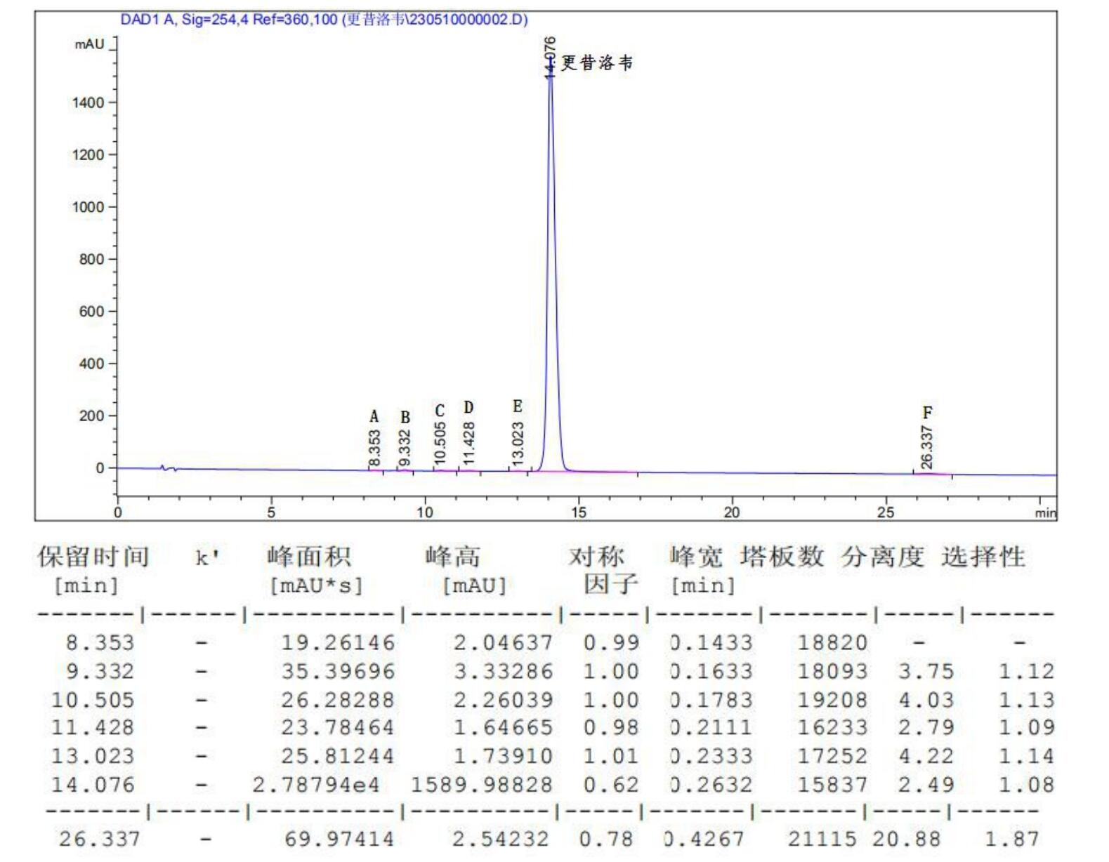 方法說明:依據 EP 標準中檢測更昔洛韋及有關物質方法,使用強陽離子交換色譜柱 SuperLu SCX 進行,更昔洛韋及雜質 A、B、C、D、E、F 就能有效分離,符合要求;對于強陽離子交換柱而言,保留強的化合物在緩沖鹽體系下會洗脫更完全,建議每日使用后用 200mM 磷酸二氫銨(pH3.5)沖洗半個小時,該步驟可較好的維護色譜柱,長時間在乙腈-0.05%TFA 下,對柱子有所損傷的,盡量不要保存過夜。