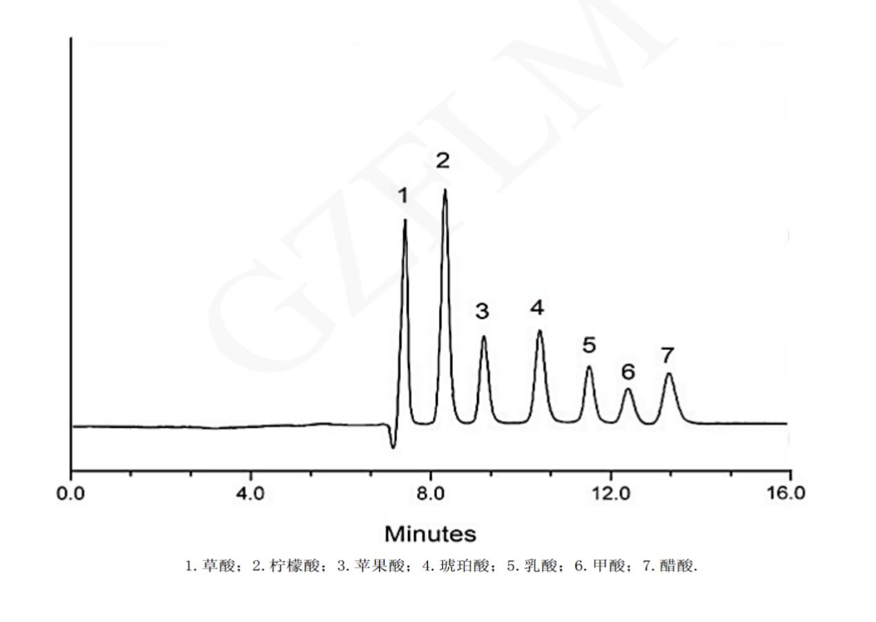 色譜柱:Mars MOA 10μm 300×7.8mm(貨號:FMH-1138-KONU) 流動相:2.5mM H2SO4 流速:0.6ml/min 進樣體積:10μL 檢測: RID 柱溫:80℃