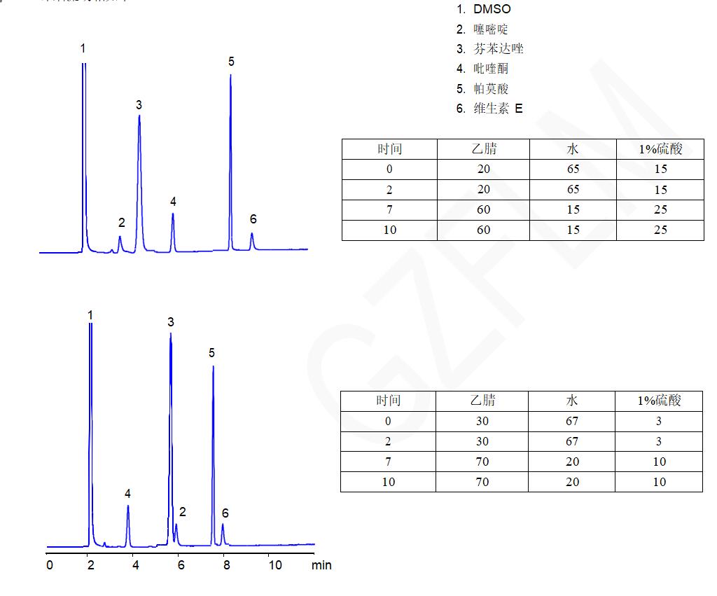 App ID: FLM-C240009 Comixsil ACRP 同時(shí)分析獸藥噻嘧啶、芬苯達(dá)、唑吡喹酮等 方法:自定 色譜柱:Comixsil ACRP 3u 150×4.6 mm(貨號(hào):FMF-ACRP3-EONU) 流速:1.0 mL/min 檢測(cè)器:215nm 詳細(xì)流動(dòng)相如下: ![]() |