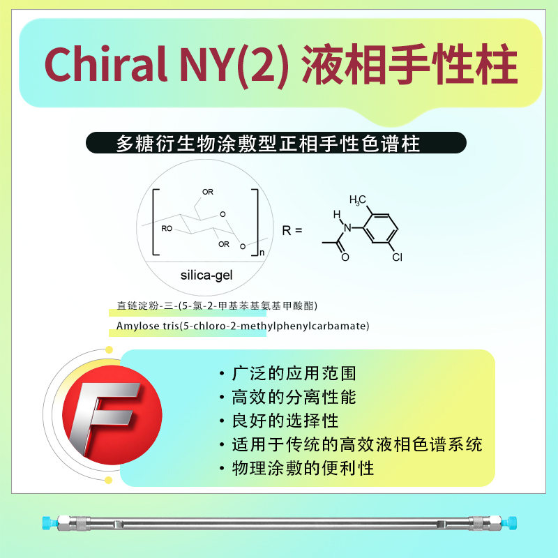 • Chiral NY(2) 液相手性色譜柱 菲羅門Chiral NY(2)手性色譜柱采用直鏈淀粉-三-(3,5-二甲基苯基氨基甲酸酯)作為手性填料,這種填料是目前世界上使用范圍最廣的一種手性填料,具有出色的分離能力。