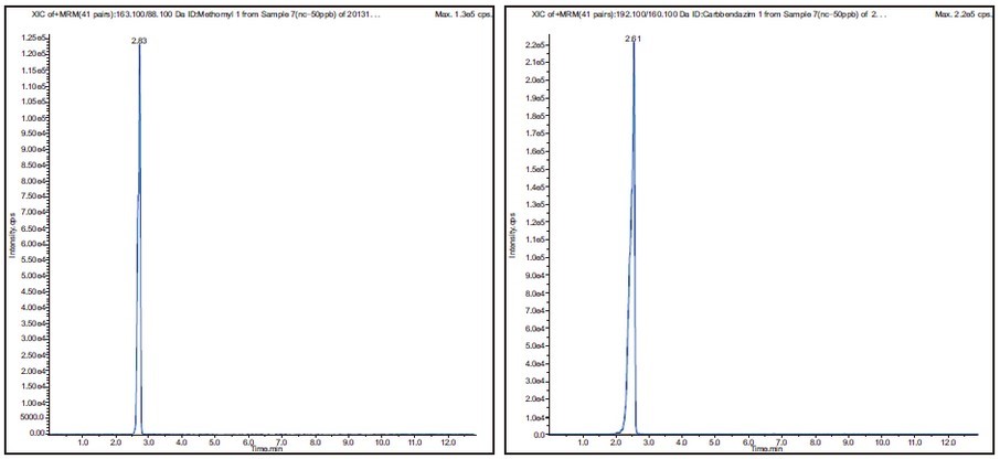 圖 2 滅多威(Methomyl)(163.1/88.1)質(zhì)譜圖 圖 3 多菌靈(Carbendazim)(192.1/160.1)質(zhì)譜圖