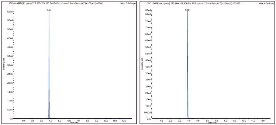 圖 4 克百威(Carbofuran)(222.1/123.1)質(zhì)譜圖 圖 5 殘殺威(Propoxur)(210.2/186.3)質(zhì)譜圖