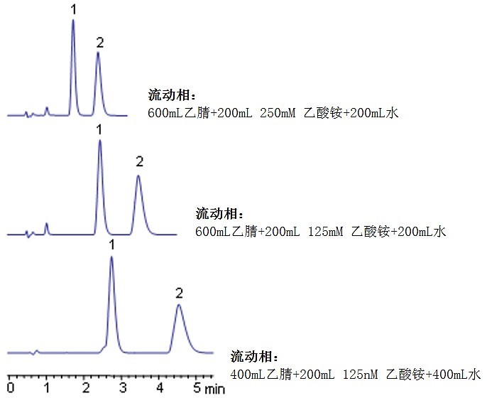 這些化合物的洗脫通過流動相中離子的強(qiáng)度和乙腈的比例來控制。