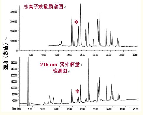 事實(shí)上,采用紫外檢測(cè)出現(xiàn)的小峰在質(zhì)譜圖中會(huì)更明顯(見圖26“*”)。